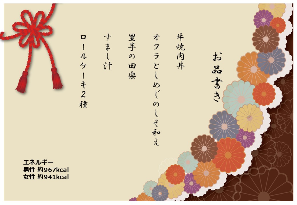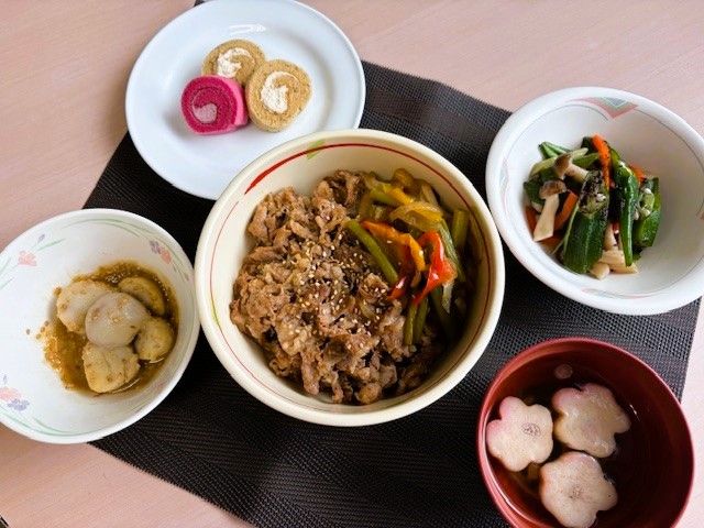 今月のバースデーランチは、牛焼肉丼・オクラとしめじのシソ和え・里芋の田楽・すまし汁・ロールケーキ2種です!前回が洋食だったので、今回は和食にしました。